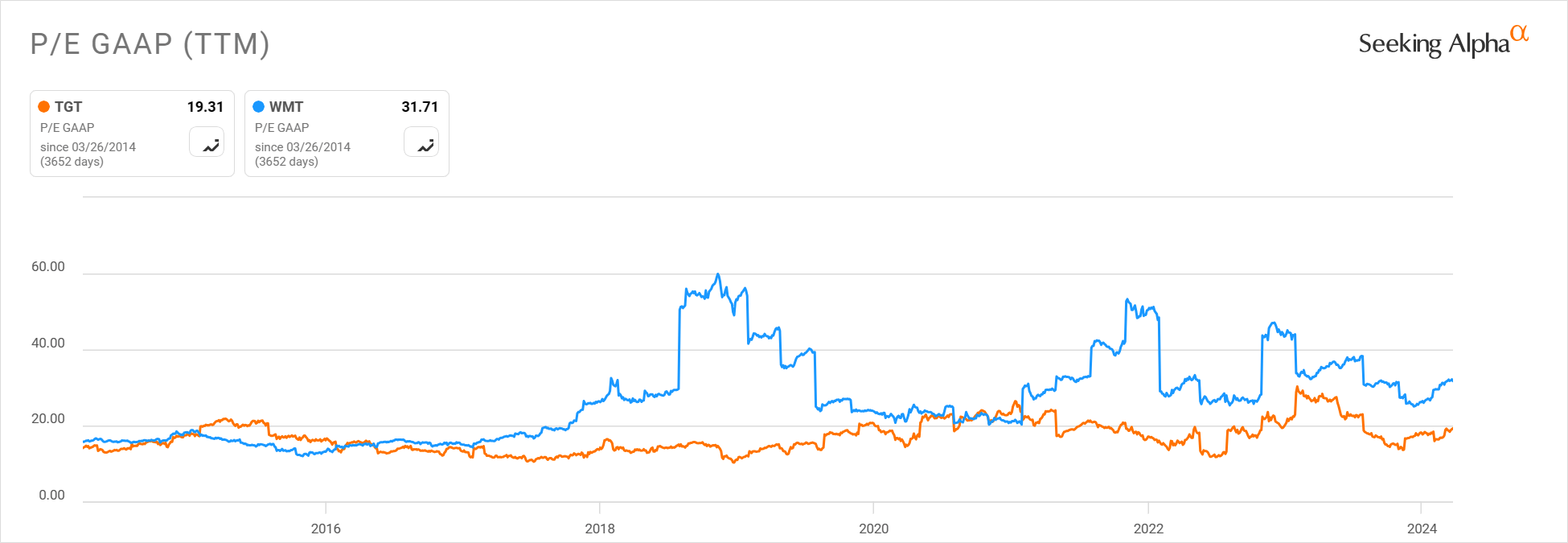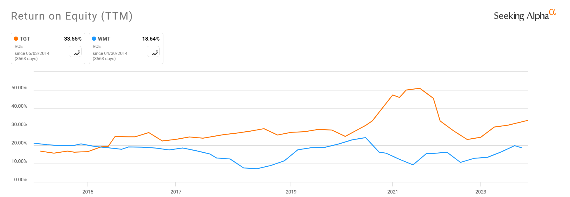 My $171 price target from last year was based on higher 2024 earnings and a lower P/E, however, I am now comfortable with the higher P/E as Target has become more efficient with its capital, as measured by return on equity. Since last year, ROE has resumed its steady upward trend after the unsustainable spike during the pandemic followed by the fall afterward. Compared to 10 years ago, Target’s ROE has doubled. It is also considerably above Walmart’s ROE, which has gone nowhere in the past 10 years.
