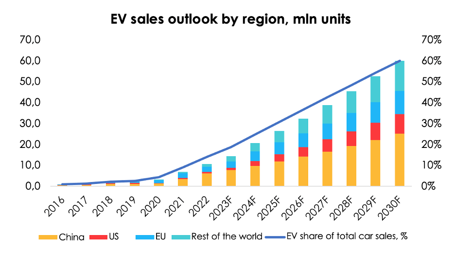 As a result of high demand for EVs from individuals in various parts of the world, despite a looming U.S. recession and declining real incomes, we are maintaining our outlook for global EV sales to reach 60 mln units by 2030.