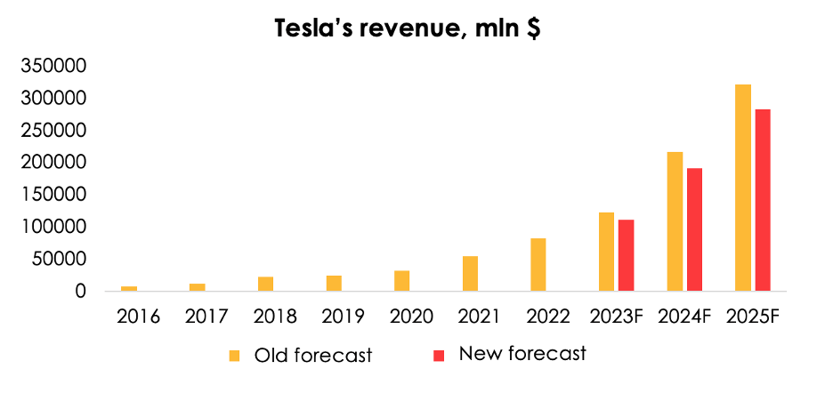 However, because of the decreased price for the Model Y – the main model in Tesla’s lineup – and slight adjustments in the energy generation and services segments, we are lowering the forecast for Tesla’s revenue from $122.4 bln (+50.4% y/y) to $111 bln (+36.4% y/y) for 2023 and from $321.6 bln (+48.7% y/y) to $282.3 bln (+47.7% y/y) 2025.