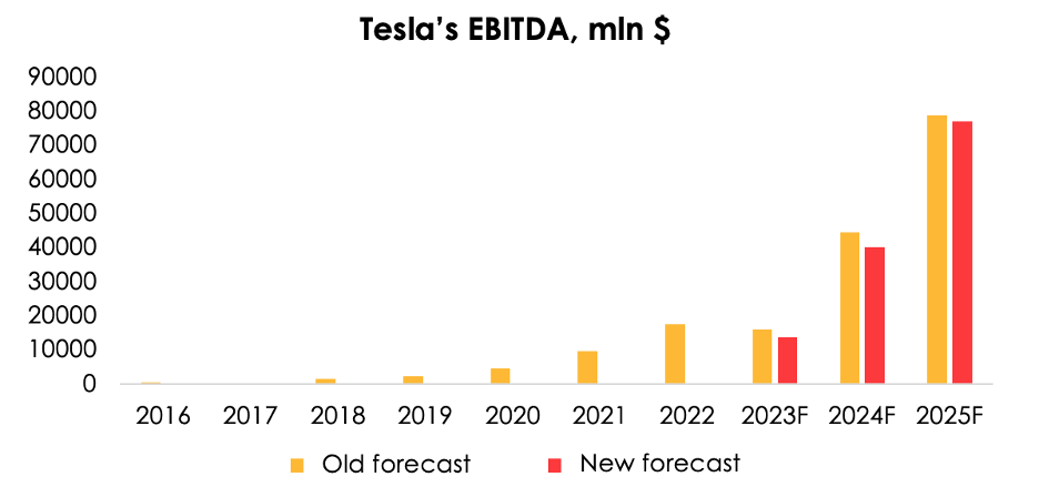 Given the contraction of revenue due to the lower price for the Model Y, we are lowering the forecast for Tesla’s EBITDA Tesla from $15.8 bln (-9.2% y/y) to $13.6 bln (-21.8% y/y) for 2023 and from $78.8 bln (+77.7% y/y) to $76.8 bln (+92.2% y/y) for 2025.
