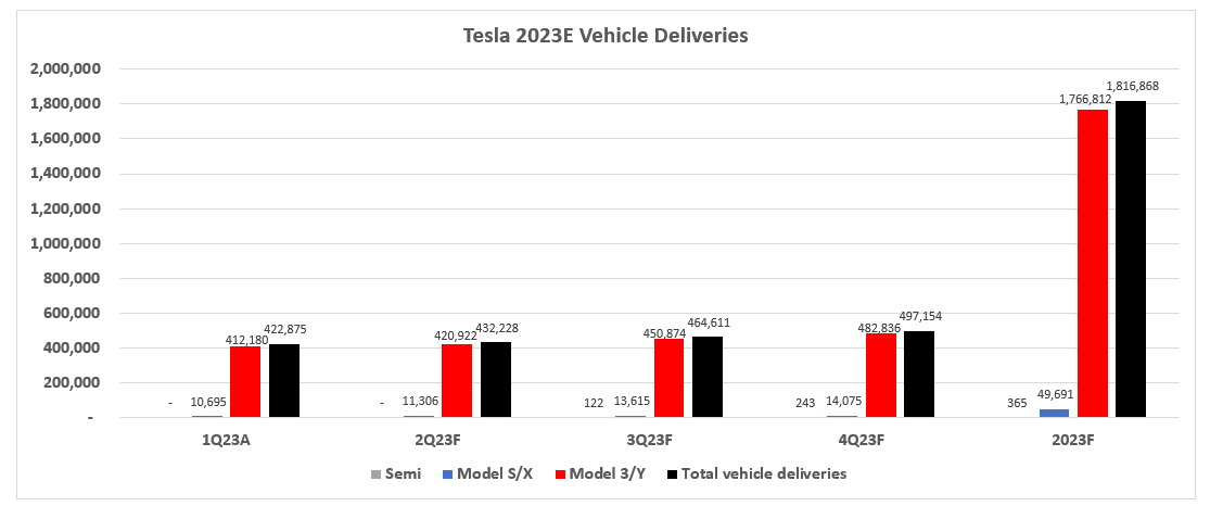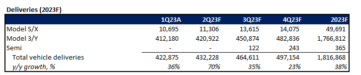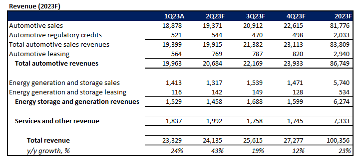 Adjusting our fundamental forecast for Tesla’s actual first quarter results, with additional consideration for recent developments and changes to its demand environment, the company is expected to grow revenues by about 24% this year to more than $100 billion. Specifically, its core vehicle sales operations will drive the bulk of full-year deceleration, with growth totaling 22% y/y to finish at about $82 billion. This takes into consideration a modest ASP in line with Tesla’s aggressive pricing strategy in recent months to overcome growing signs of sluggish auto demand as consumer sentiment weakens on looming recession risks. Full year deliveries are likely to exceed 1.8 million units, with the Model 3/Y remaining the core driver, helped by a competitive pricing strategy as well as the incremental demand that is expected to stem from all of its models’ eligibility for the full $7,500 purchase credit under the IRA.