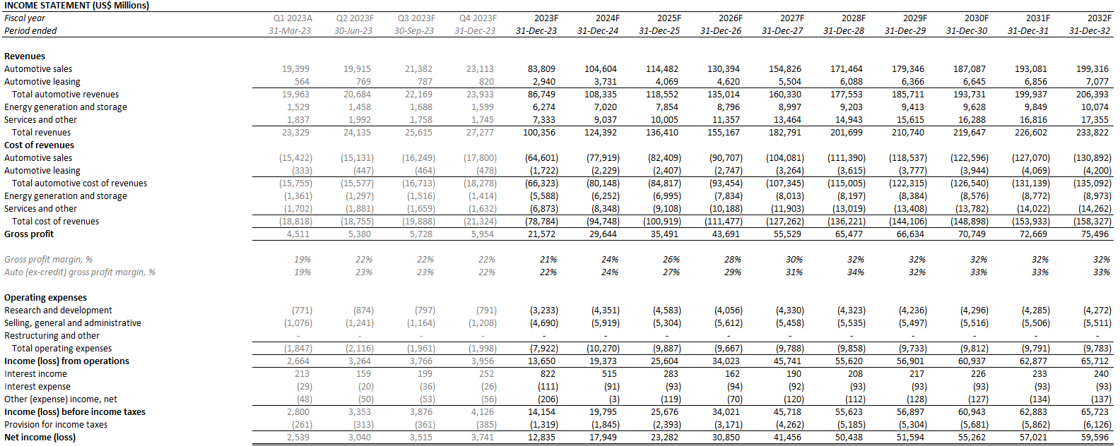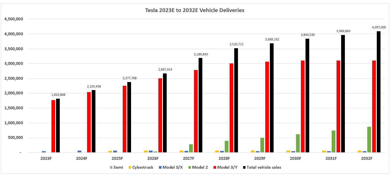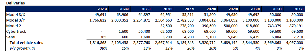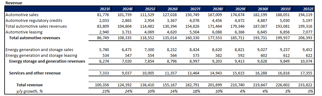 And over the longer term, considering reasonable expectations for greater competition and further dilution of Tesla’s first-mover advantage in the industry, total revenues are expected to expand at a CAGR of about 9% through 2032. Specifically, core automotive revenues and deliveries are likely to average about 9% annual growth over the next decade, with take rates normalizing more prevalently approaching 2030 due to the combination of competition, and expected ASP reductions on Tesla’s longer-term plans to focus on affordability.