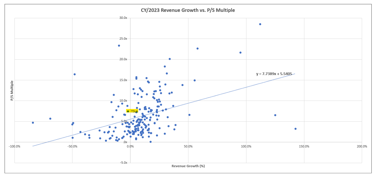 And considering a multiple-based valuation approach, Tesla’s current market value at about 8x estimated sales remains largely in line with the broader tech peer group considering near-term prospects. But at about 70x estimated earnings, the stock prices in significant optimism into the underlying business’ profit outlook, despite headwinds to its margins ahead. [peer comp]