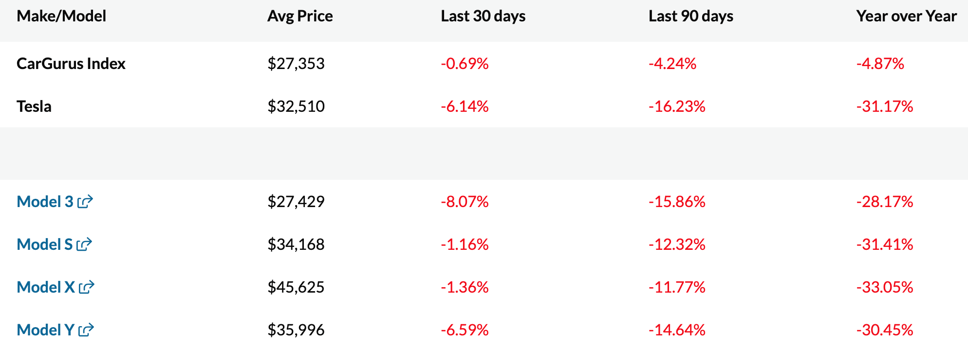 In the same period, the CarGurus Index inched down just 0.7 percent, meaning Teslas depreciated an order of magnitude faster than the average used car listed up for resale in the United States.