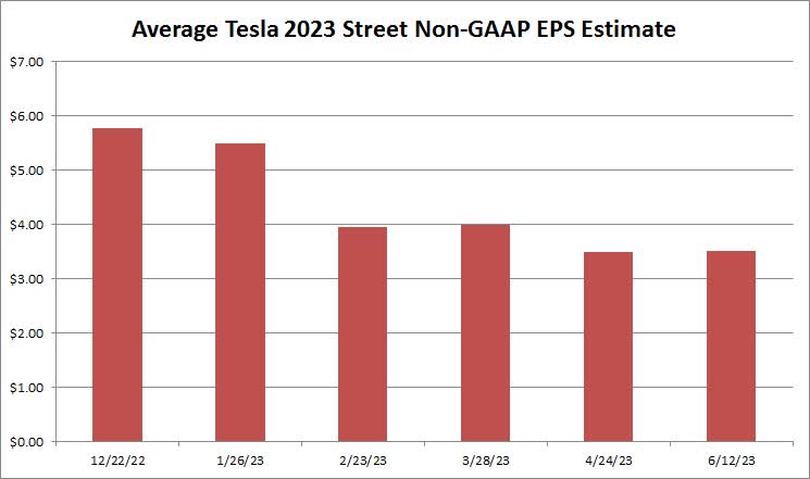 One of the possible reasons for Tesla’s surge in share price recently is that the price cuts are behind us and analysts will be raising estimates soon. As the chart below shows, this year’s EPS average has bottomed for now, and has actually increased two cents since late April. Of course, if Tesla comes out in early to mid July and cuts prices across the board again, analysts will likely be tripping over themselves to cut their gross margin and earnings expectations.