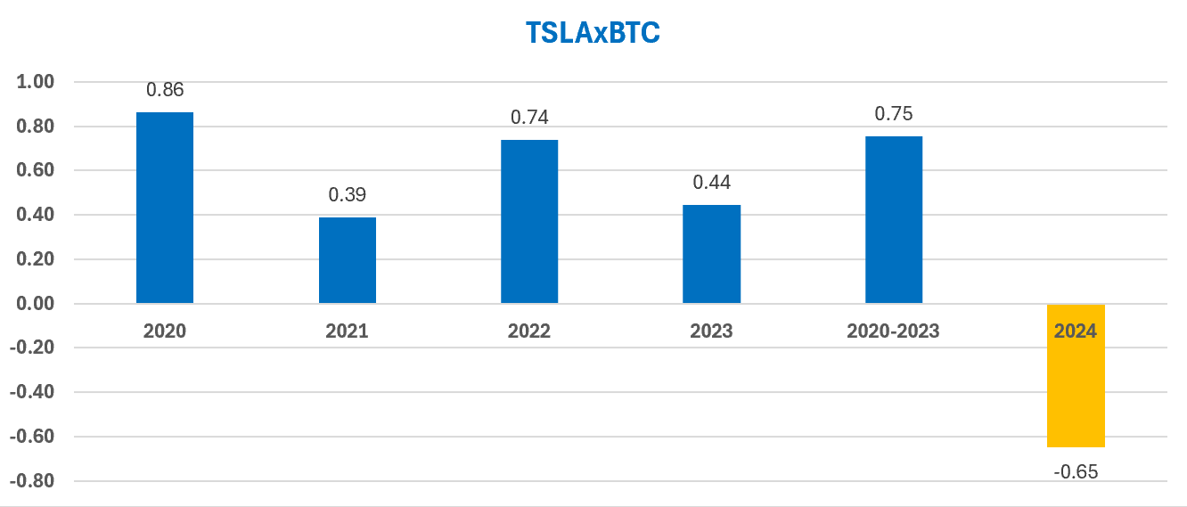 On Bitcoin, I point out that that the TSLA x BTC correlation over the past 3 years overall has been 0.75 (strong correlation). However, correlation flipped negative, to -0.65 in 2024 YTD (strong negative correlation).