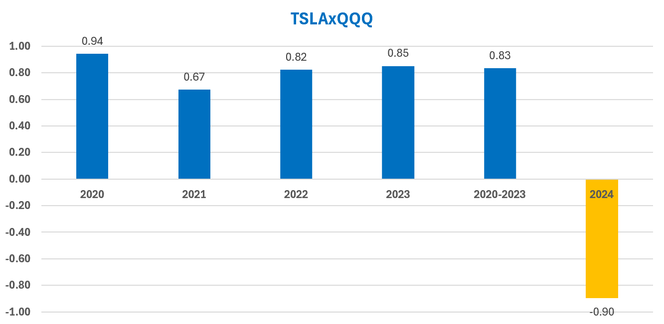 An even stronger correlation pattern is evident when mapping TSLA x QQQ: Over the past 3 years, correlation between the two assets has been 0.83 (very strong correlation); but the metric flipped aggressively in 2024 YTD, to -0.9 in 2024 (very strong negative correlation).