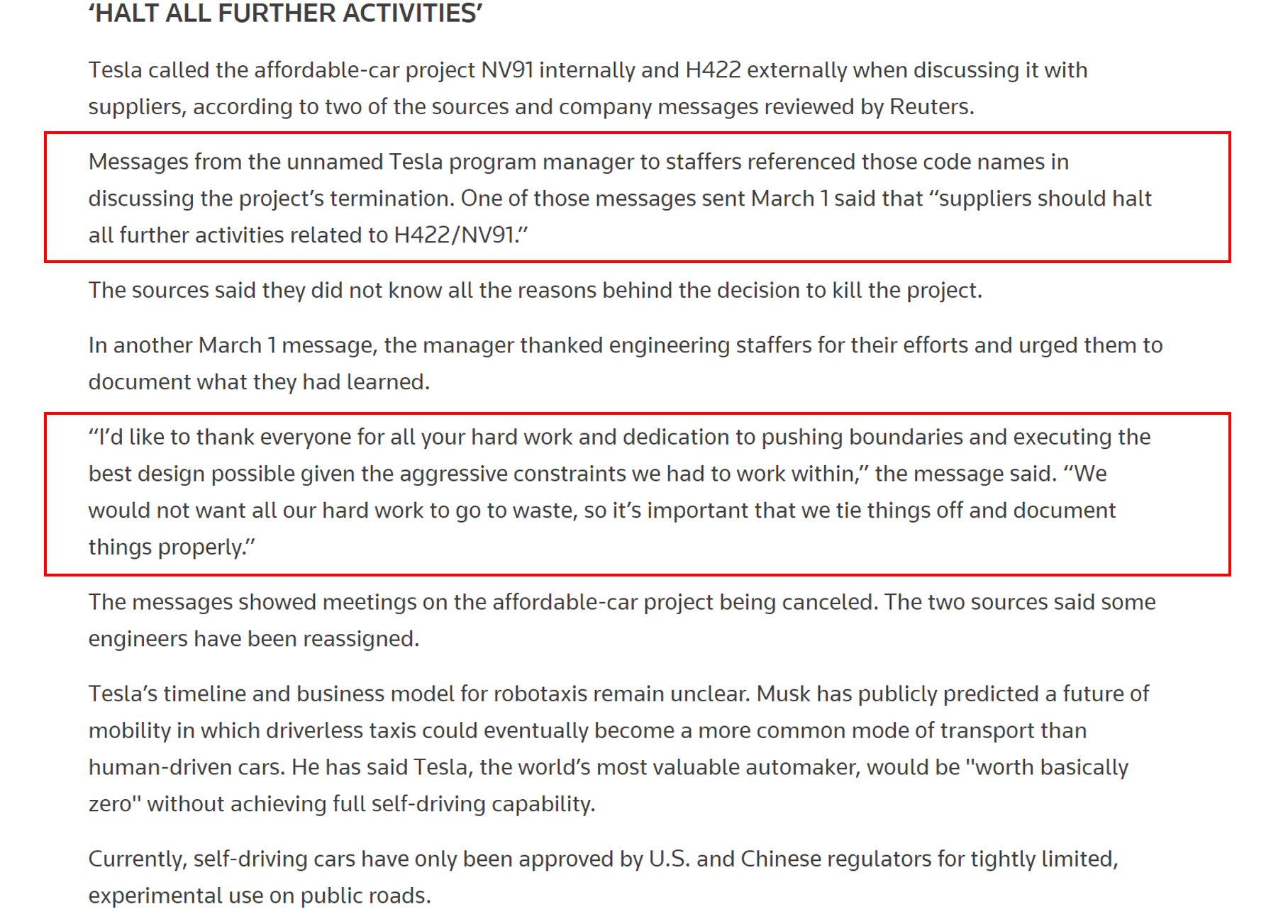 Shortly after the disappointing Q1 2024 deliveries, news broke that Tesla has reportedly cut its plans to develop/ produce a low-cost car. And while CEO Elon Musk has been quick to contest the news, I highlight that the reporting by Reuters has been quite specific, and thus credible (see below).