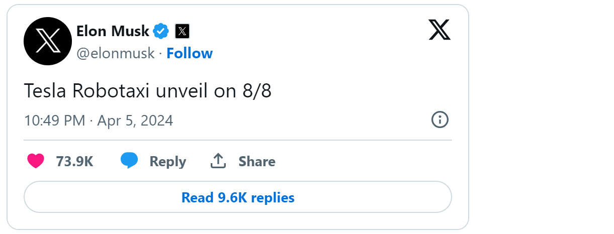 On April 5th, and likely as a counter-balance to the negative news flow relating to the low-cost car model, Elon Musk boldly announced through his personal X/ Twitter account that Tesla will unveil its Robotaxi product on August 8th. This prompted shares to trade higher by almost 4% in aftermarket trading activity.
