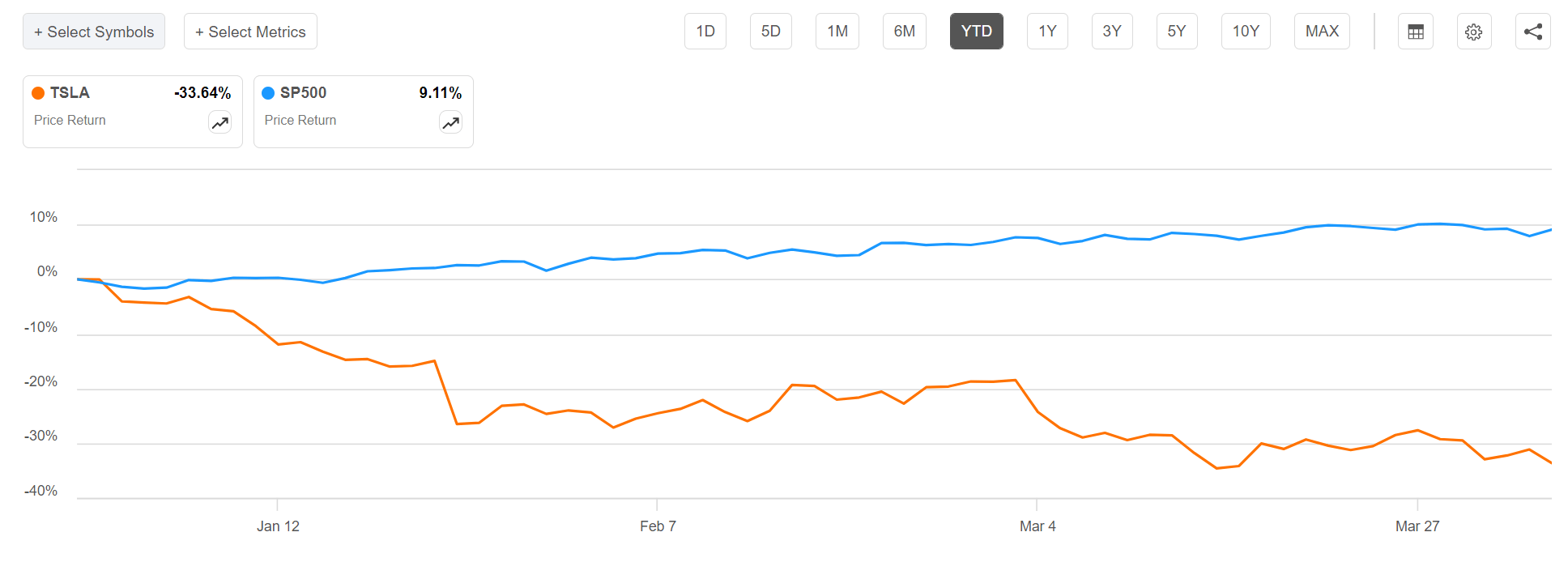 As a consequence, and in line with my thesis, Tesla’s selloff in early 2024 did accelerate: Since the start of the year, TSLA shares are down about 33%, compared to a bullish 9% gain for the S&P 500 (SP500).