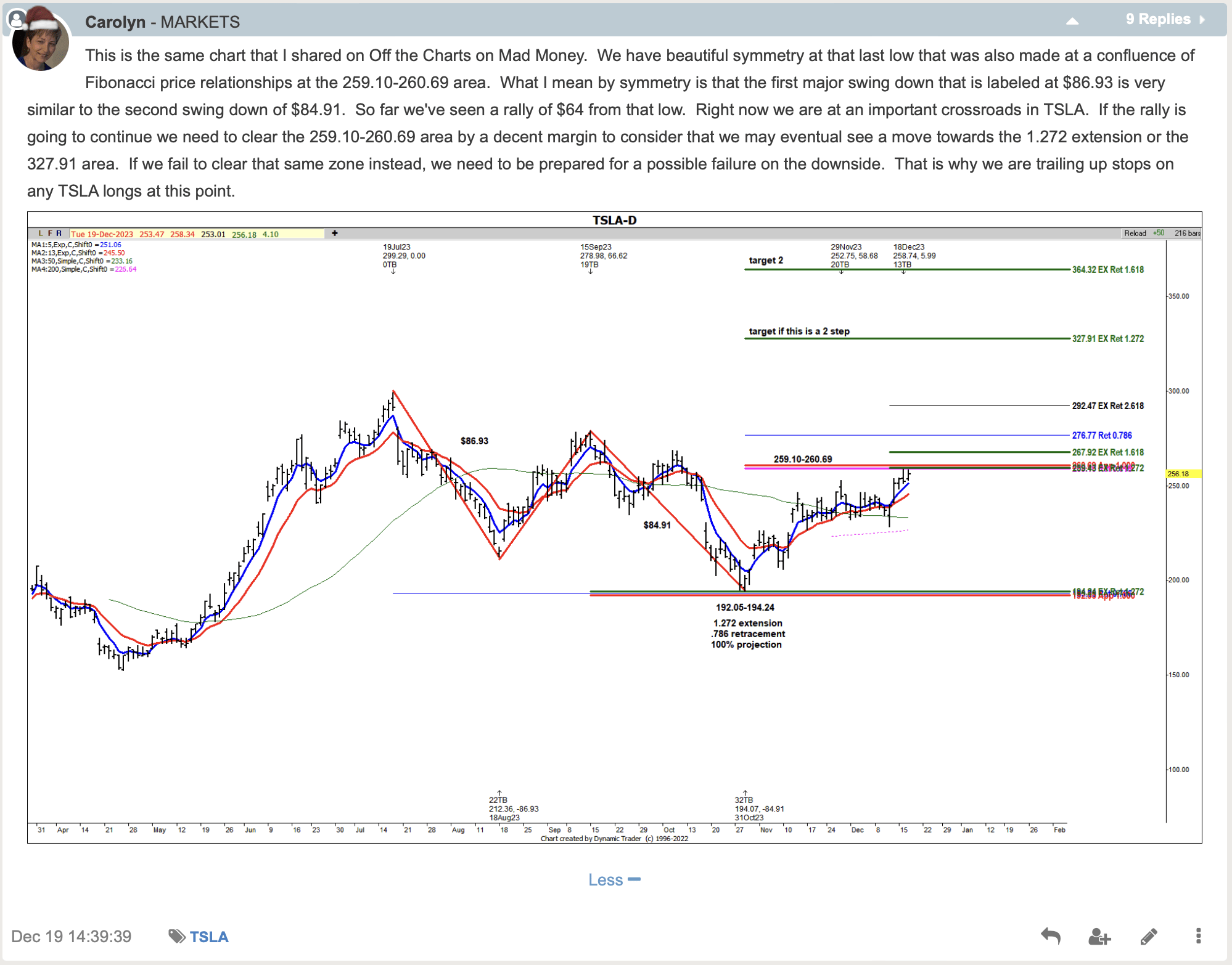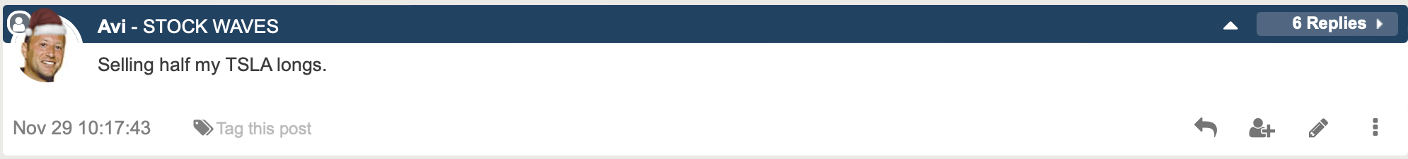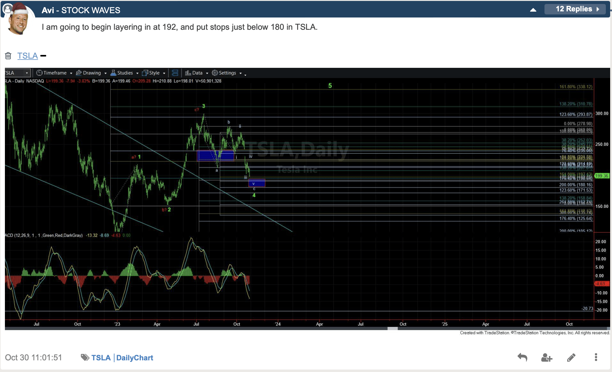 It was at the end of October that we were able to identify a specific buy setup with defined risk vs reward. In fact, Avi Gilburt commented specifically on this setup, even posting his buy and a sell of TSLA shares. Note the date/time stamps that show the buy at 192 and the sell at the 250 area.