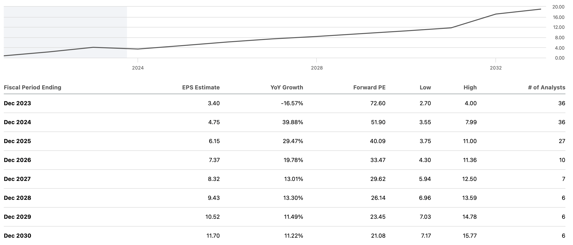 In 2022, Tesla reported an EPS of $4.07. However, this year’s consensus estimates are for $3.40, a 17% YoY decline. The lower EPS is due to transitory factors like a slow macroeconomic environment, higher costs due to inflation, price cuts, and other temporary phenomena. Therefore, Tesla’s profitability should improve as the economy exits the downturn and economic conditions improve.