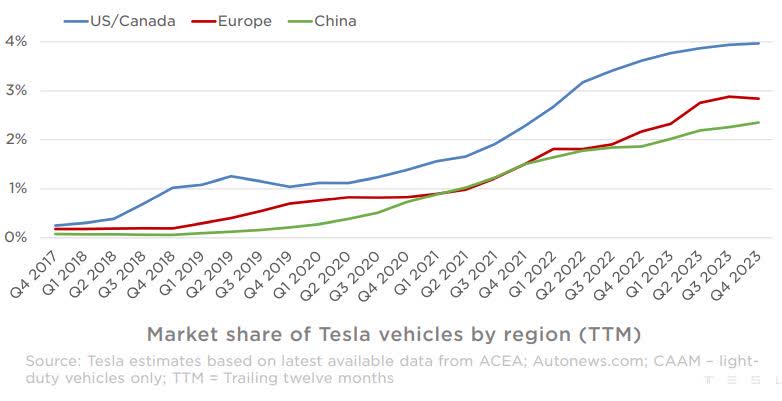 The following chart shows that the rate of Tesla’s EV market share rise has slowed over the last year in North America, Europe, and China.