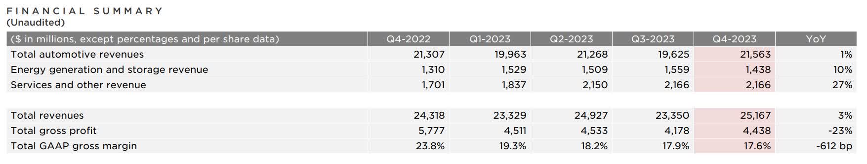 The financial summary above shows that the total fourth revenue only grew 3% to $25.167 billion, $596.79 million lower than consensus analysts’ estimates. Also, note how gross profit dropped 23% year-over-year and gross margin declined 612 basis points (“bps”) since the previous year’s comparable quarter to 17.6%. These declines are largely the result of Tesla cutting prices for its vehicles. Additionally, the production ramp-up of the new Cybertruck had costs that negatively impacted gross margins.