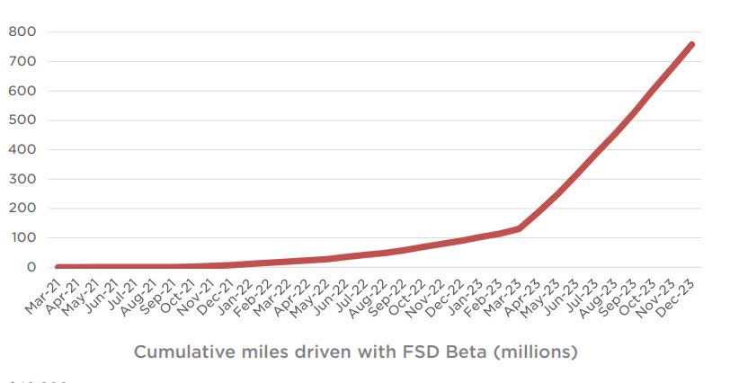 One of the significant advantages that Musk believes Tesla has over other companies attempting to build self-driving cars is data. The company has more vehicles with autonomous technology operating on U.S. roads, collecting real-time data from its cars than its competitors. If you listen to enough Tesla earnings calls, you may hear management brag about the enormous amount of data the company collects to train its AI. This data potentially gives Tesla an advantage in training its AI algorithms on a broader range of driving scenarios and edge cases, leading to safer vehicles, better performance, and faster development than rivals with less data. The following chart shows FSD Beta miles driven. The chart looks like it is going parabolic.
