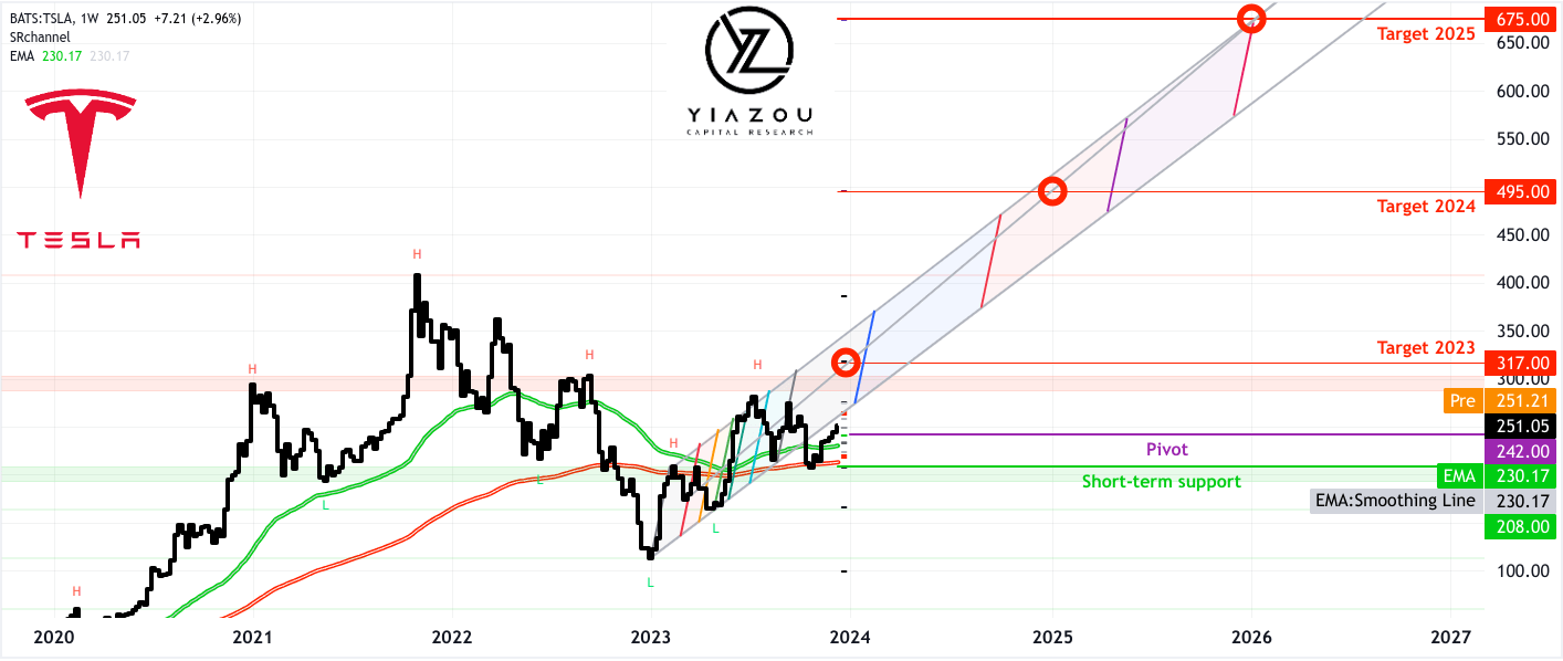 TSLA stock has outperformed the market in 2023 with over 100% return against the total return of 25% by the S&P 500. Considering the trend in 2023 as an impulsive wave based on Elliott Wave Theory and the Fibonacci Channel, horizontally, the application of Fibonacci retracement suggests the price may hit $317, while the stock is currently trading at near $250. The huge price gap can be filled by rapid-up moves before the end of 2023, inspired by the Santa Claus Rally, where $242 is a critical support for the stock price.