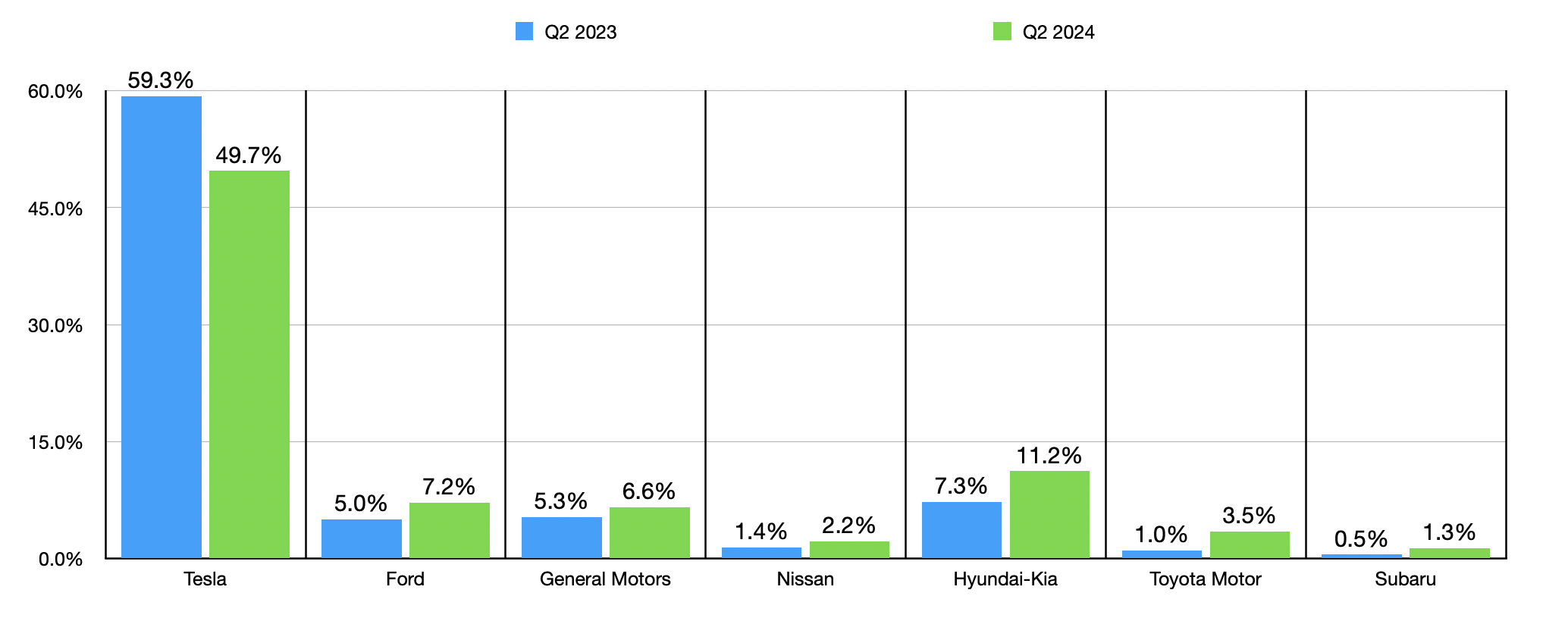 Contrary to some rhetoric that has developed over the past several months, the number of electric vehicles sold in the US is not declining. In the second quarter of 2024, there were 330,463 electric vehicles sold in this country. That marked an increase of 11.9% compared to the 295,355 sold the same time last year. But during this time, Tesla reported a drop of 6.3% in the number of electric vehicles sold throughout the country. In fact, the company’s market share continues declining. In the second quarter, it was 49.7%. That was down from 52.1% in the first quarter and down from 59.3% in the second quarter of 2023. Other companies are doing considerably better. Hyundai-Kia reported a rise in market share from 7.3% in the second quarter of 2023 to 11.2% at the same time this year. General Motors saw a rise from 5.3% to 6.6%. And Ford (F) grew its market share from 5% to 7.2%. Even marginal players in the electric vehicle space are performing well. In the chart above, you can see the year-over-year improvement in market share for the second quarter for some of these firms.