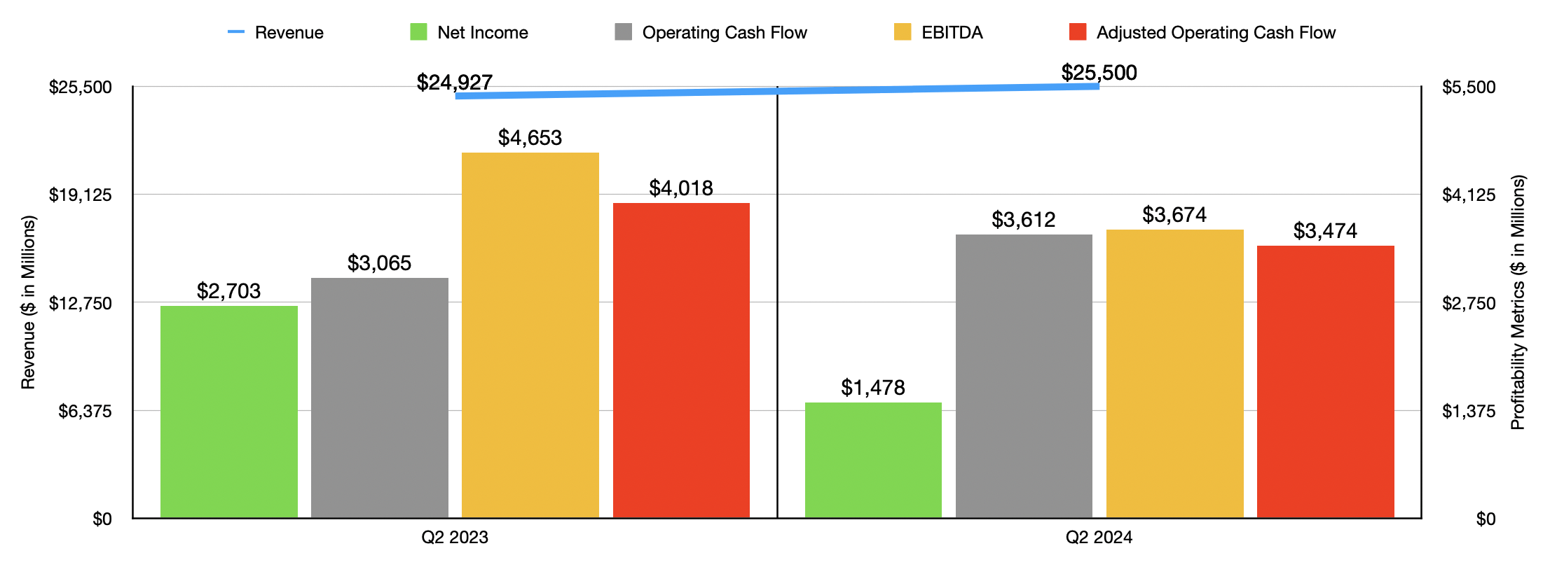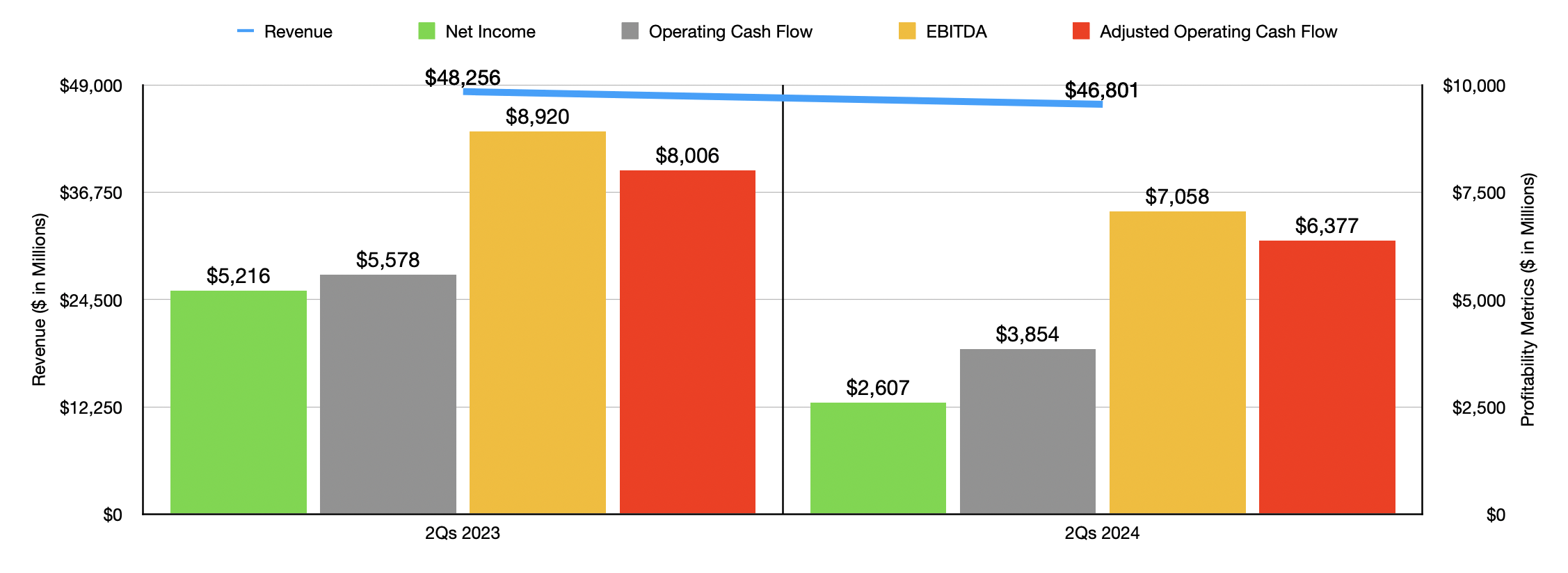 As you can see in the chart below, financial performance for the first half of 2024 compared to the first half of 2023 is very similar to what we saw in the second quarter of this year relative to the same time last year. Even though the company is seeing growth in some parts of its operations, earnings and cash flows are plummeting as vehicle pricing drops and as the number of deliveries declines substantially. In fact, earlier, I stated that automotive sales revenue for the second quarter of this year was down 9.3% compared to the same time last year. But for the first half of this year as a whole, it was down a whopping 11%.