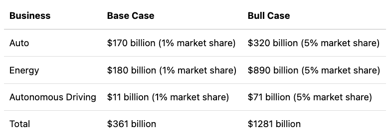 • The valuation analysis indicates a wide range of potential values for Tesla, depending on its future market share in various segments.