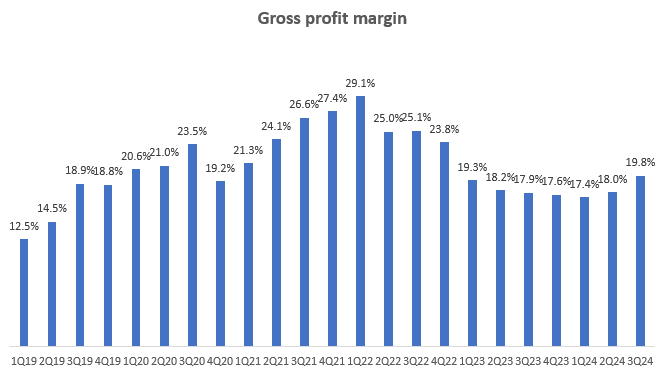 • Margin performance is at local highs but is likely to revert a bit, driven by fluctuations in the nature of energy business projects and lower average selling price pressures.