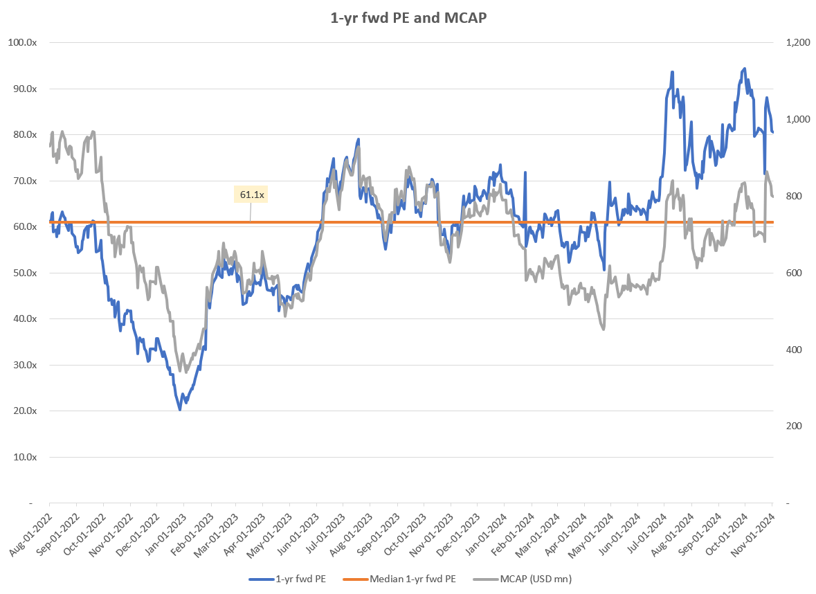 • Valuations are at a premium, driven by full self-drive and Optimus expectations. I believe this is acceptable, contingent on the timelines of robotaxis and FSD rollout being intact in FY25.