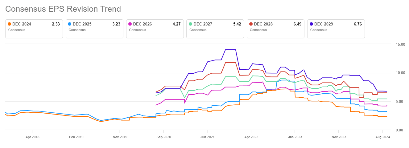 Low EPS expectations, however, are driven mainly by challenges in the EV market and recent sales data from Chinese EV manufacturers showed that deliveries are rebounding hard, at least in China. If Tesla has a successful robotaxi event dishing up specifics and a concrete time-line for a market introduction, I believe Tesla’s longer term EPS estimates could rise nicely and also help boost shares ahead of the company’s Q3’24 earnings date.