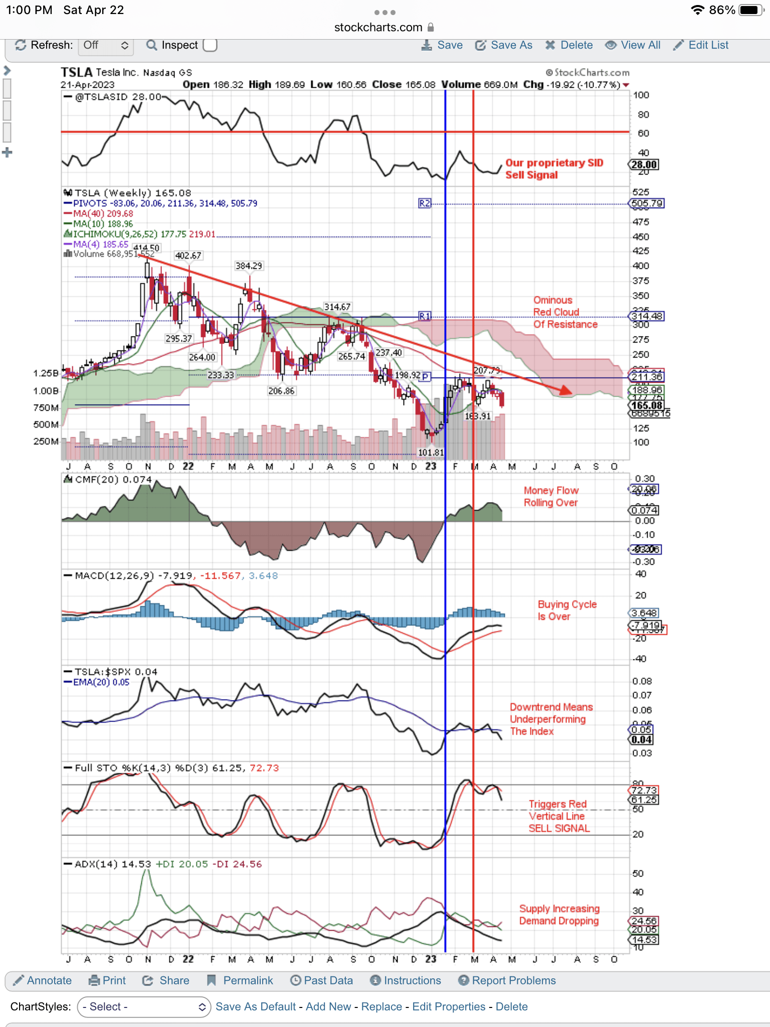 Here is our weekly chart showing the Sell Signals that we think will take TSLA back down to $102 where bottom fishers came in last time.