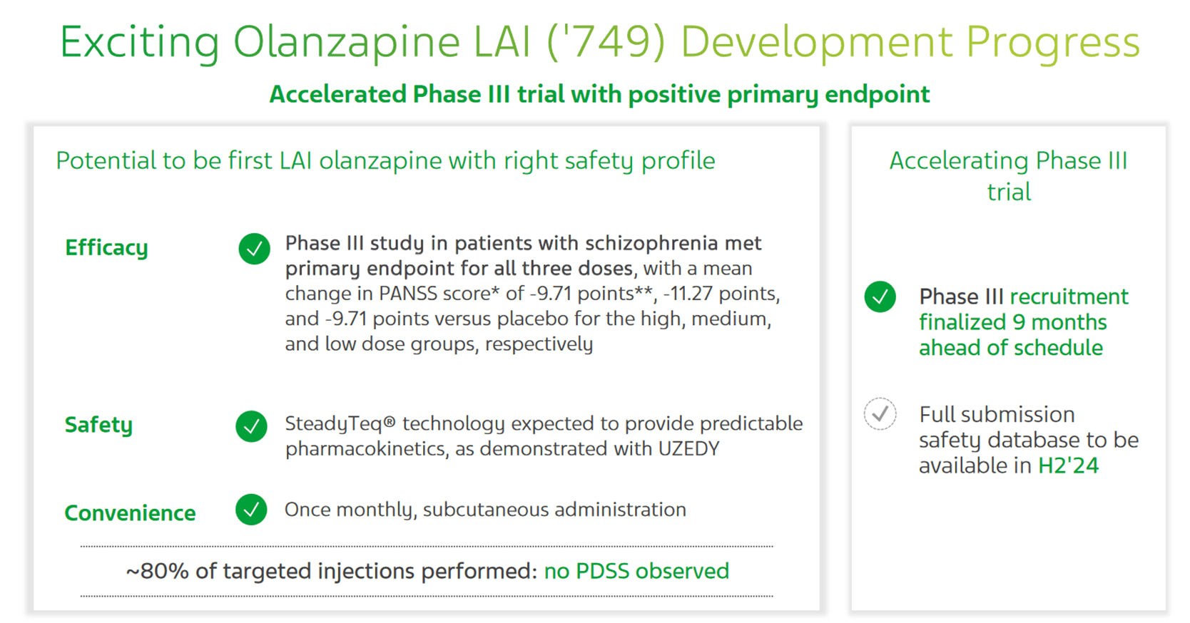 So, on May 8, 2024, Teva published the results of a pivotal clinical study that assessed the efficacy of TEV-‘749 in the treatment of schizophrenia. The data showed that this long-acting injection of the second-generation antipsychotic olanzapine not only met primary and secondary endpoints, but its efficacy in combating this mental disorder that affects approximately 3.5 million Americans was higher than my expectations.