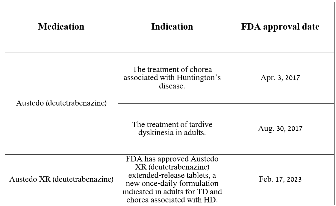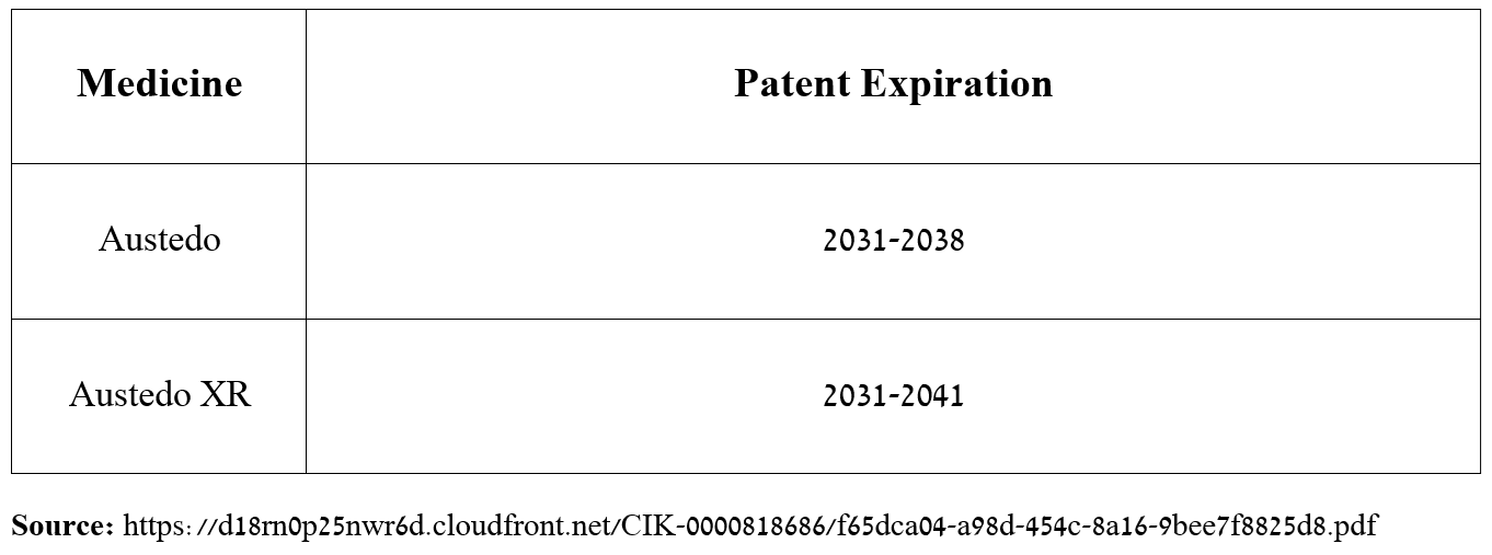 Before moving on to discussing their total sales, patent protection, and indications for use, I want to note that the only significant difference between these two medications is that Austedo XR is an extended-release formulation of deutetrabenazine, which is used once a day, unlike Austedo, which is used twice a day.