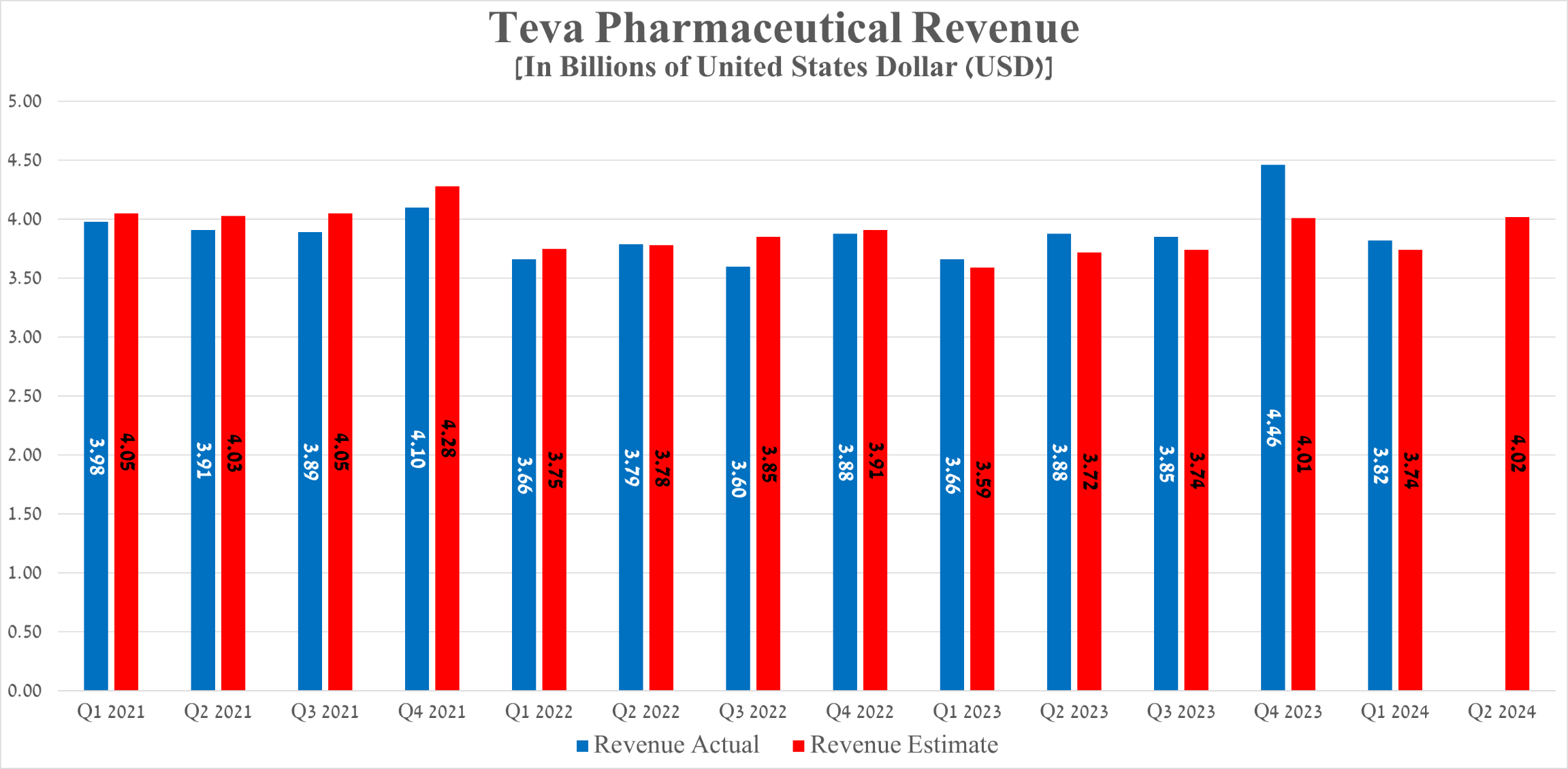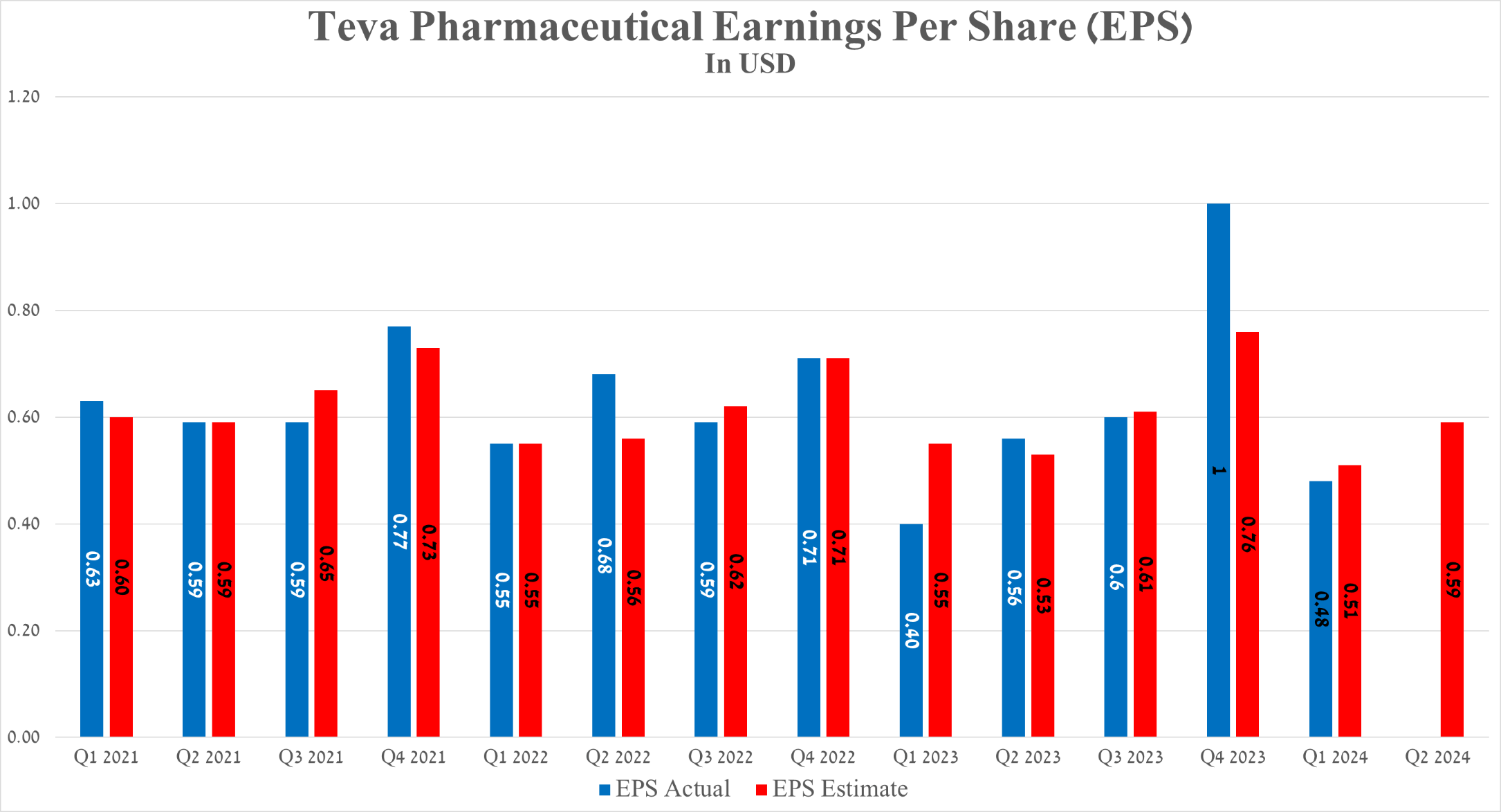 Teva Pharmaceutical’s earnings per share for the first three months of 2024 were 48 cents, up 8 cents from the first quarter of 2023. In contrast, its EPS is anticipated to be between 53 and 61 cents in the second quarter, up about 11.3% from analysts’ expectations for the previous year.
