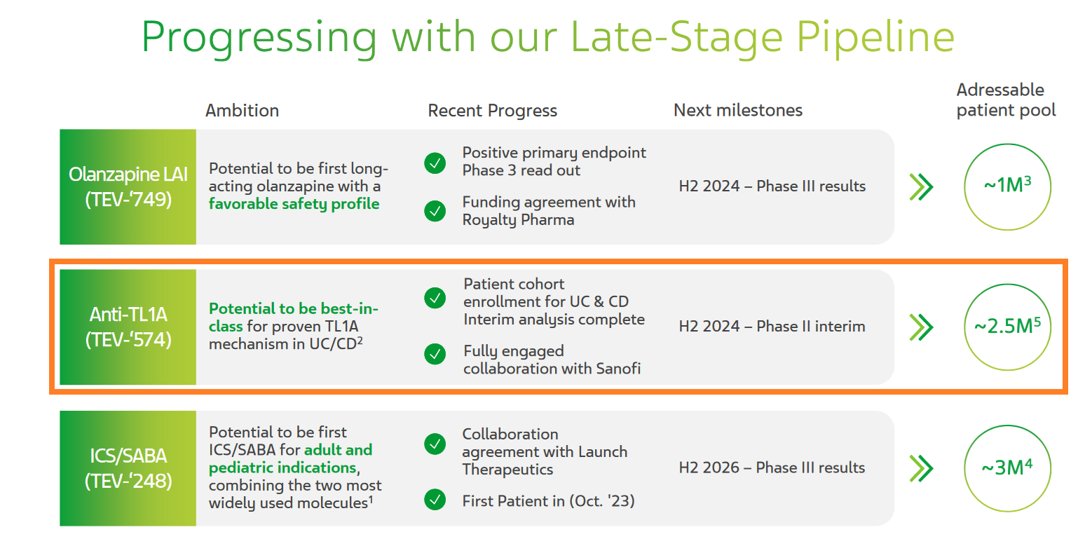 I believe 2024 continues to be one of the key years in the company’s history as Teva expects to publish the results of various clinical trials evaluating the efficacy of TEV-‘574, which is developing for the treatment of ulcerative colitis and Crohn’s disease, as well as olanzapine, which has the potential to become the “gold standard” in the treatment of schizophrenia.