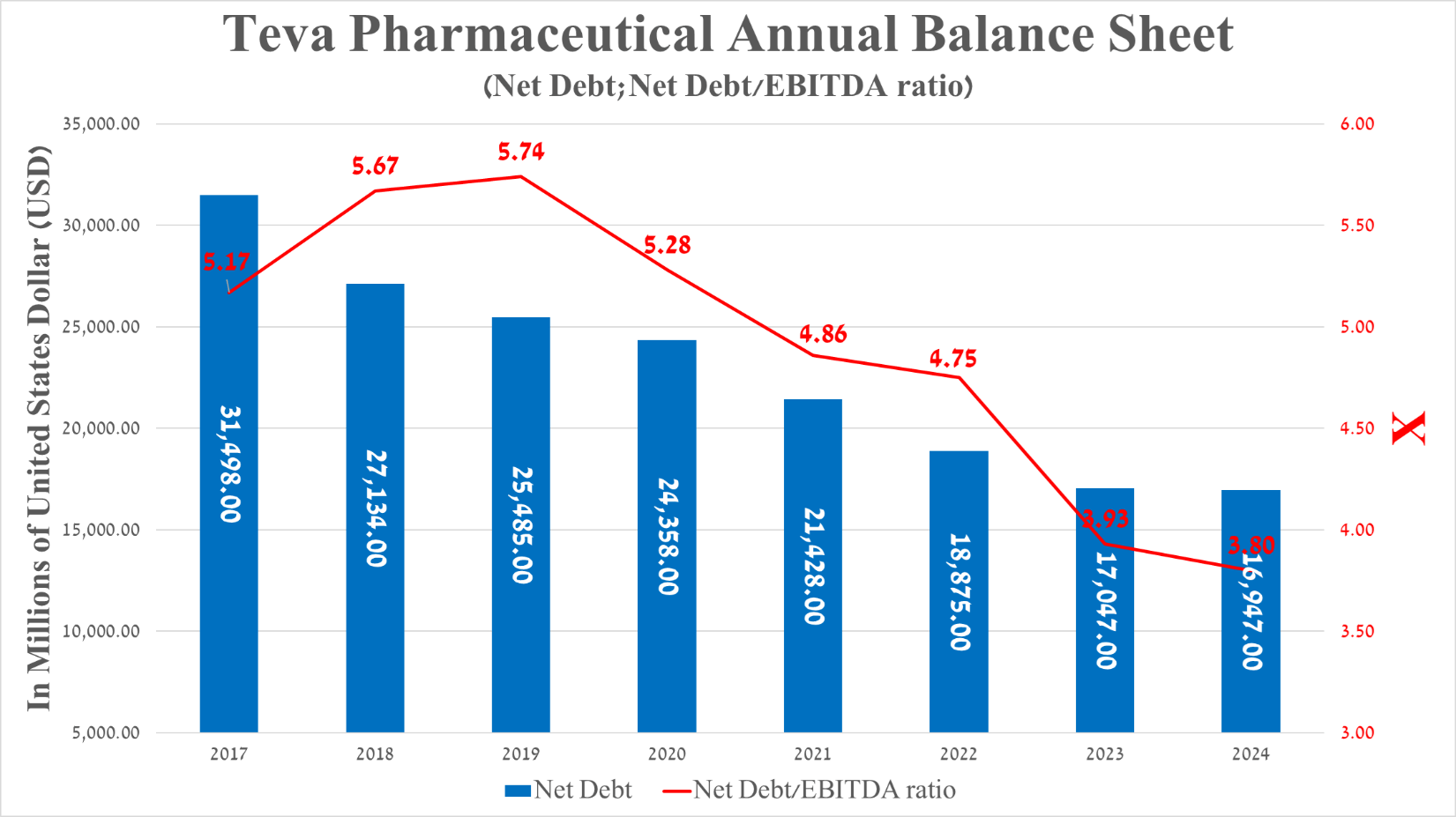 So, its net debt was about $16.95 billion at the end of March 2024, continuing to decline after the completion of the disastrous acquisition of Actavis Generics in 2016.