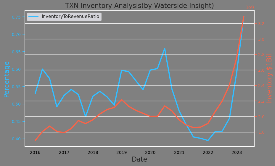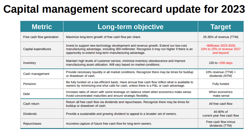 In reviewing Texas Instruments’ capital management target for 2023, we can see the areas in which it will most likely make efforts are free cash flow generation, inventory reduction, and perhaps dialing down its CapEx to some degree. Its days of inventory was at about 182 days in Q1, and it could expect to rise up to above 200 days within its target.