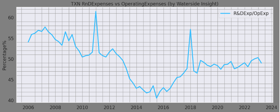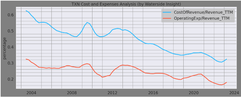 These research and development efforts also connect with the fact that Texas Instruments does most of its manufacturing in-house. The results are astounding. It essentially has almost halved both its cost of revenue and operating expenses with respect to its revenue in less than 20 years of time.