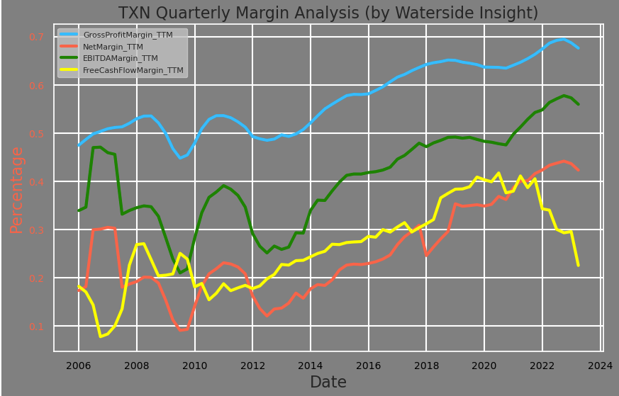 - Texas Instruments has consistently focused on organic growth and shareholder return, resulting in strong gross profit margin and EBITDA margin growth over the past decade.