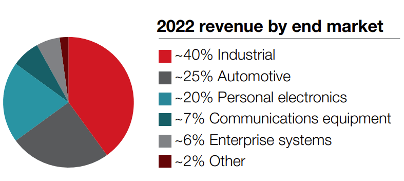 Texas Instruments has six end markets grouped by the type of customers for their products. The largest by revenue is Industrial, with Automotive and Personal Electronics coming close to each other at 20-25%, while Communication equipment and Enterprise systems are in the mid-teens. The company stated in its 10k that it emphasizes Industrial and Automotive segments, which represent long-term growth potential to it.