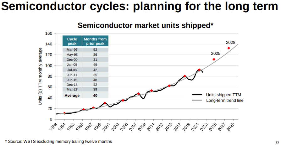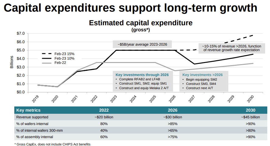 The company indicated that it would raise Capex if there was an opportunity to invest in its future growth advantages. Given its focus on extending its 300-mm cost advantage in these chips and strengthening its supply chain, the company has set a target for this spending to remain substantial: $5 billion per year for the next three years and then at 10-15% of revenue after that.