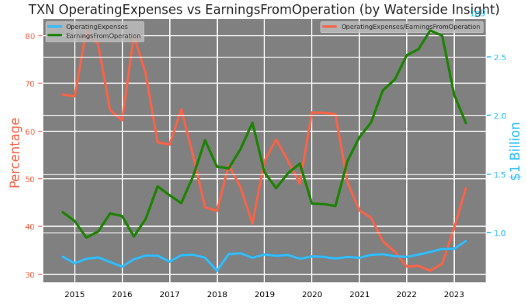 Looking at its operating expense, they have risen from 30% to around 50% as a percentage of earnings from operations, which is the average before the pandemic for the company. It’s not an alarming number, given its history. This rise isn’t due to a sudden increase in operating expenses but rather a drop in its earnings from the operation – declining from its peak of $2.7 billion in Q2 2022 to about $1.9 billion in the last quarter.
