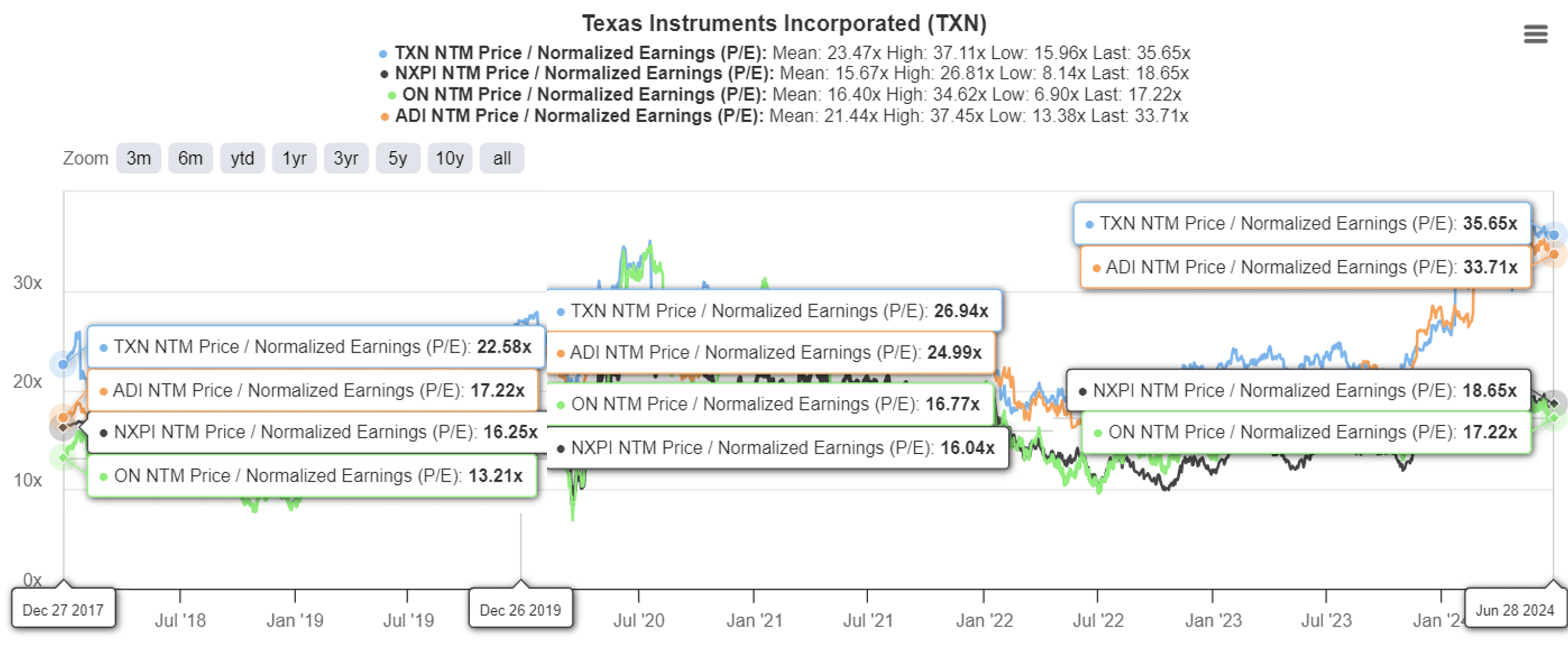 The same premium has been observed in its analog chip peers as well, such as ADI at FWD P/E valuations of 33.71x, and to a smaller extent, in ON Semiconductor (ON) at 16.95x and NXP Semiconductors (NXPI) at 18.93x, compared to their historical means.
