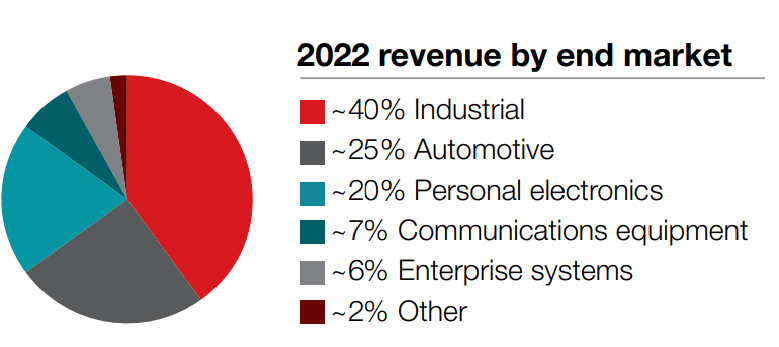 - Texas Instruments is the market leader in the analog and embedded chip segment, serving various end markets, particularly industrial and automotive.