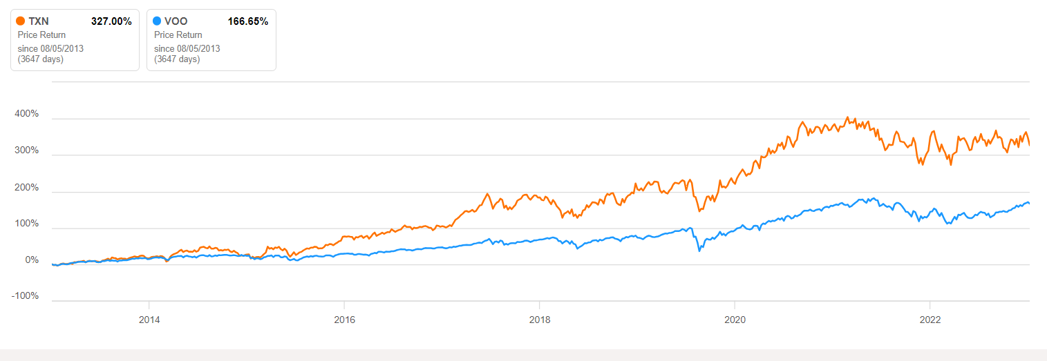 At the moment a lot of technology stocks are on fire, because of AI driven expectations. Sometimes companies are trying to use the word AI as much as possible in their reports to further boost the hype. There are also some technology companies that don’t want to surf on the hype and even said that they have an allergy for words like AI, IoT and 5G, so they usually don´t speak about it. One of these companies is Texas Instruments Incorporated (NASDAQ:TXN).This company is letting the cash flow doing the talk and TXN has a proven track record of market beating results over the long term.