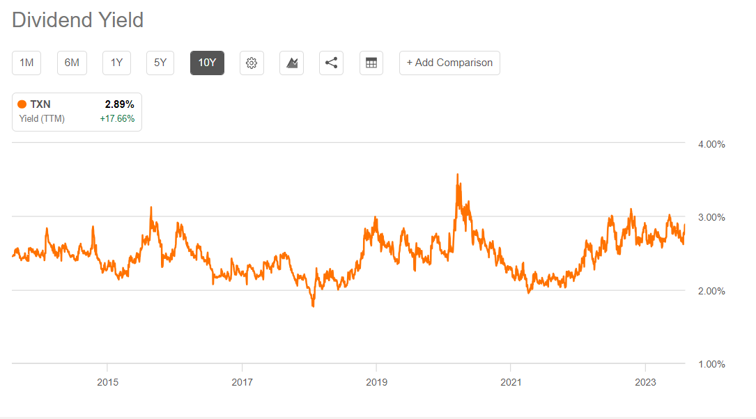 At the moment TXN pays a dividend of $4.96 per share, with a current share price of $168.46 this comes down to a dividend yield of 2.89%. This is higher than its own 5 year average of 2.68%.From a yield perspective this could be an attractive entry point.