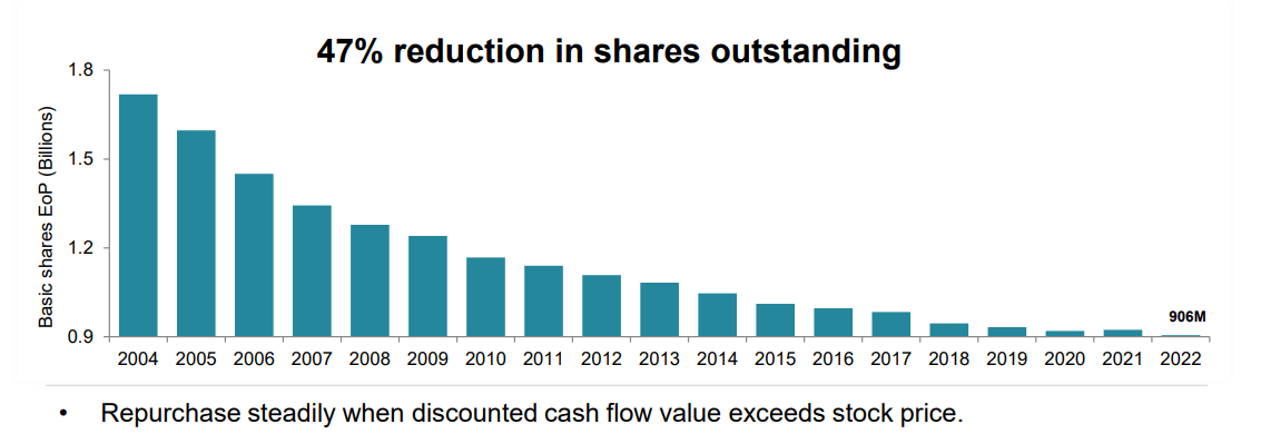TXN states that they are focused on share buybacks when the share price is below the intrinsic value of the company based on reasonable growth assumptions. In the last 10 years they bought back around 189.5 million shares, which is 17.3% of their total shares outstanding. I really like their approach of repurchasing shares with a value investors mindset. However, this is really hard to see in the numbers. From a numbers point of view it looks like TXN is buying back shares at a more consistent rate.