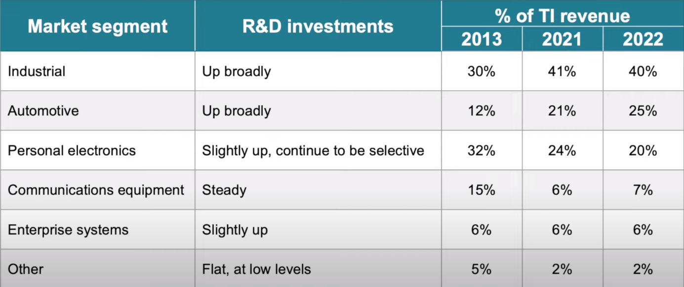 As previously discussed, TXN is shifting more towards Industrial and Automotive. At the end of 2022 the industrial and automotive segment accounts for 65% of the total revenue and they even think that this percentage will be higher in 2023, because of the robustness of this market segments.