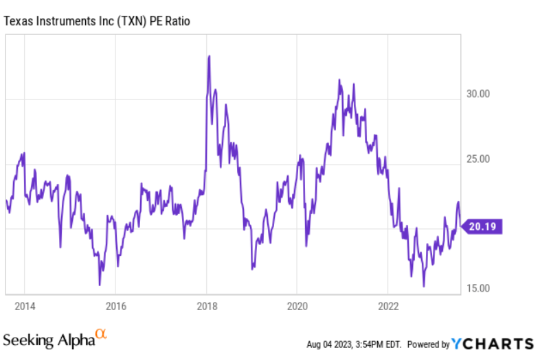 At the moment TXN has a PE ratio of 20.19, this is below its 5Y average of 21.85. Looking at the 10 year chart this could be a solid entry point.