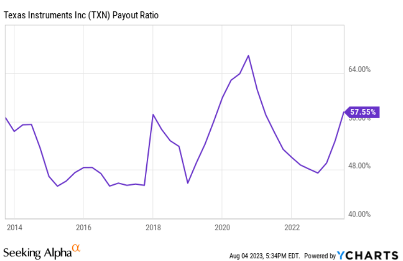 The dividend is relatively safe at the moment with a payout ratio of 57.55%, based on annual dividend per share divided by non-GAAP earnings per share. On a 10-year basis, TXN has been able to keep it in the 45-60% range most of the time, which I consider healthy.