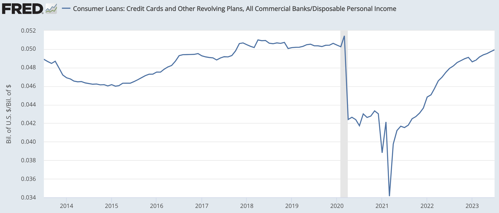 However, I think it is crucial to remember that while credit card balances are rising to new highs that wages have also risen substantially over the past four years. Higher wages mean people can support higher loan balances, all else equal. That is why I like to look at loan balances relative to disposable income to see if consumers are borrowing more or less compared to what they earn. Using this metrics, we are essentially right back to where we were in 2018-2019, a time when the economy was solid.