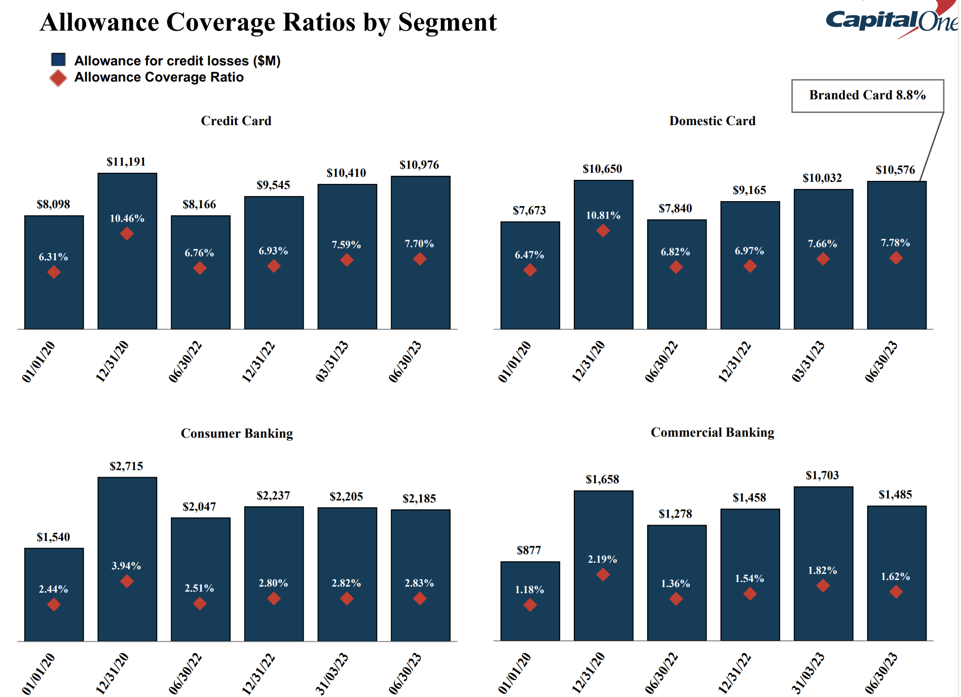 Even as it takes up reserves and added to deposits, Capital One has been increasing its capital position, with Tier common equity of 12.7%, up from 12.1% in Q4 2022, as the company retained about $950 million in earnings this year to prepare for the rise in its stress capital buffer to 4.8% from 3.1%. Still, the company was able to restart its repurchases in Q2, buying back $150 million in stock. In 2019, with lower reserves prior to the accounting change, capital was also slightly lower than current levels at 12.2%.