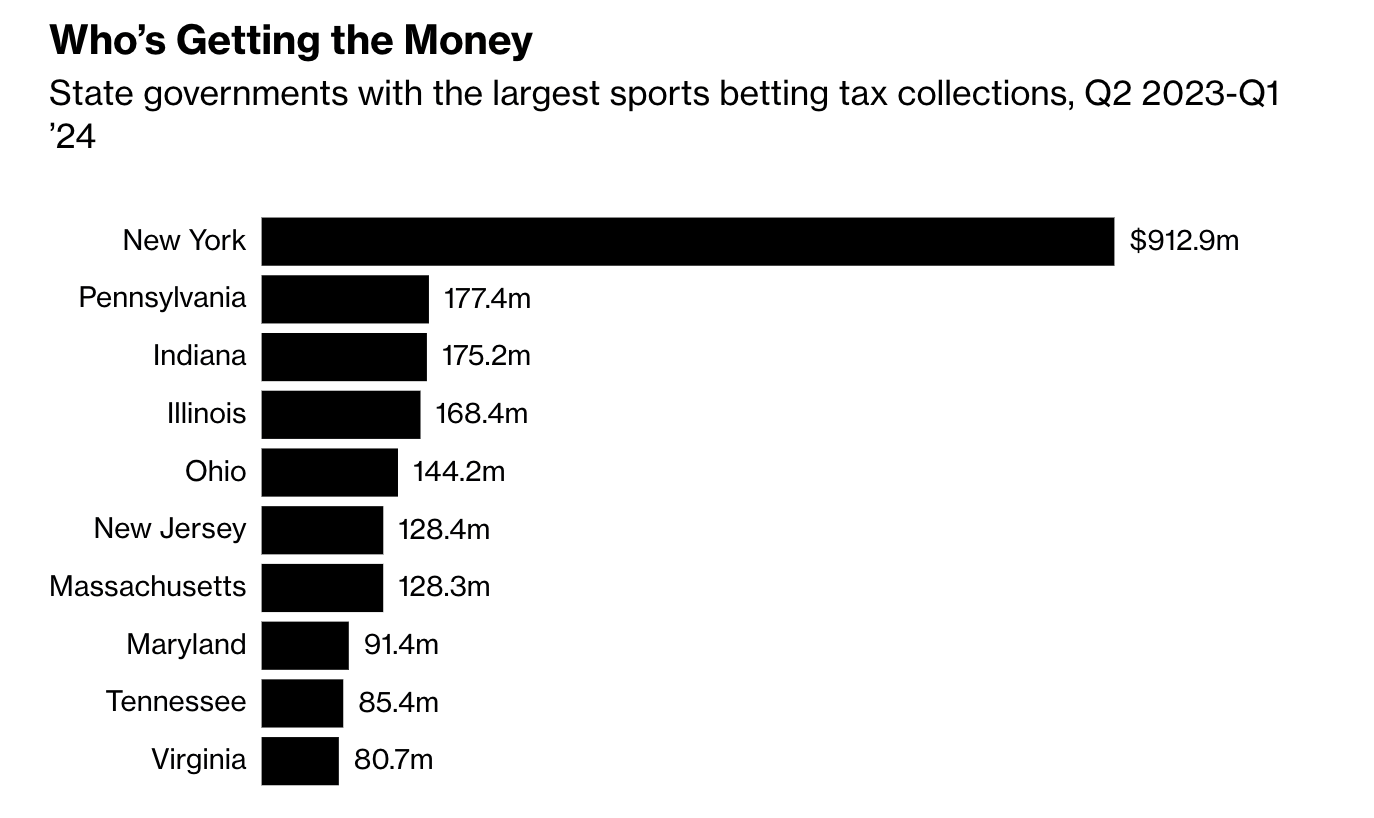 Here’s a Bloomberg chart I found, which shows tax collections from sports betting between 2Q23 and 1Q24: