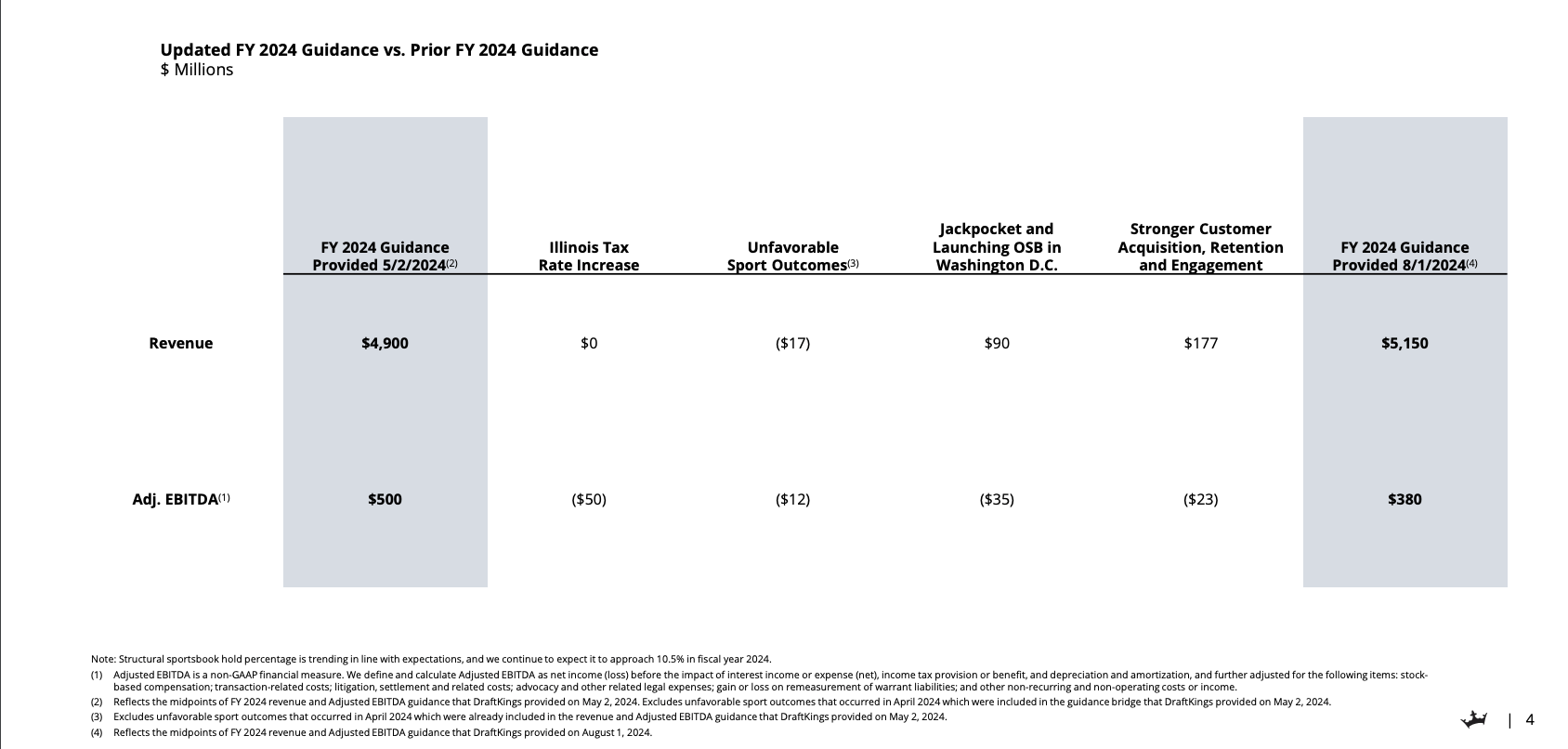 However, DraftKings adjusted its 2024 adjusted EBITDA guidance to a range of $340 million to $420 million. This is down from the previous range of $460 million to $540 million.